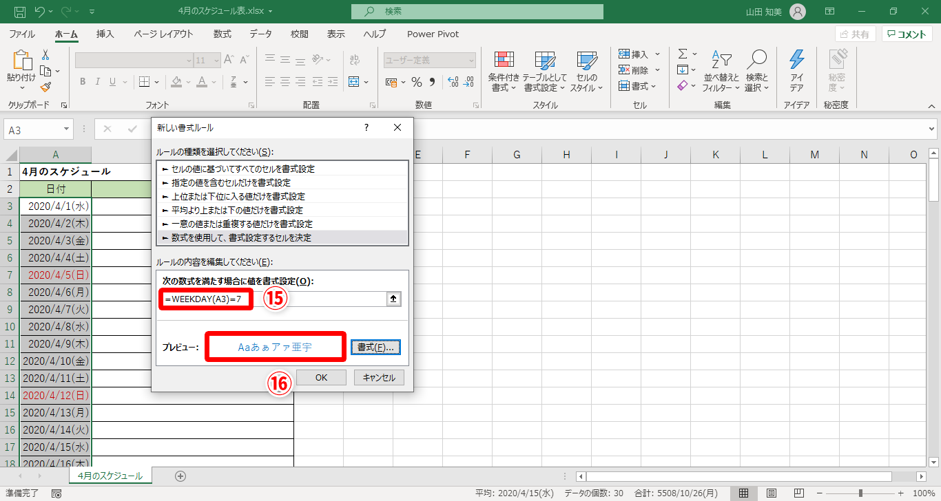 【Excel】土曜は青、日曜は赤、祝日はオレンジに!エクセルのスケジュール表で日付を色分けする方法(8/15)