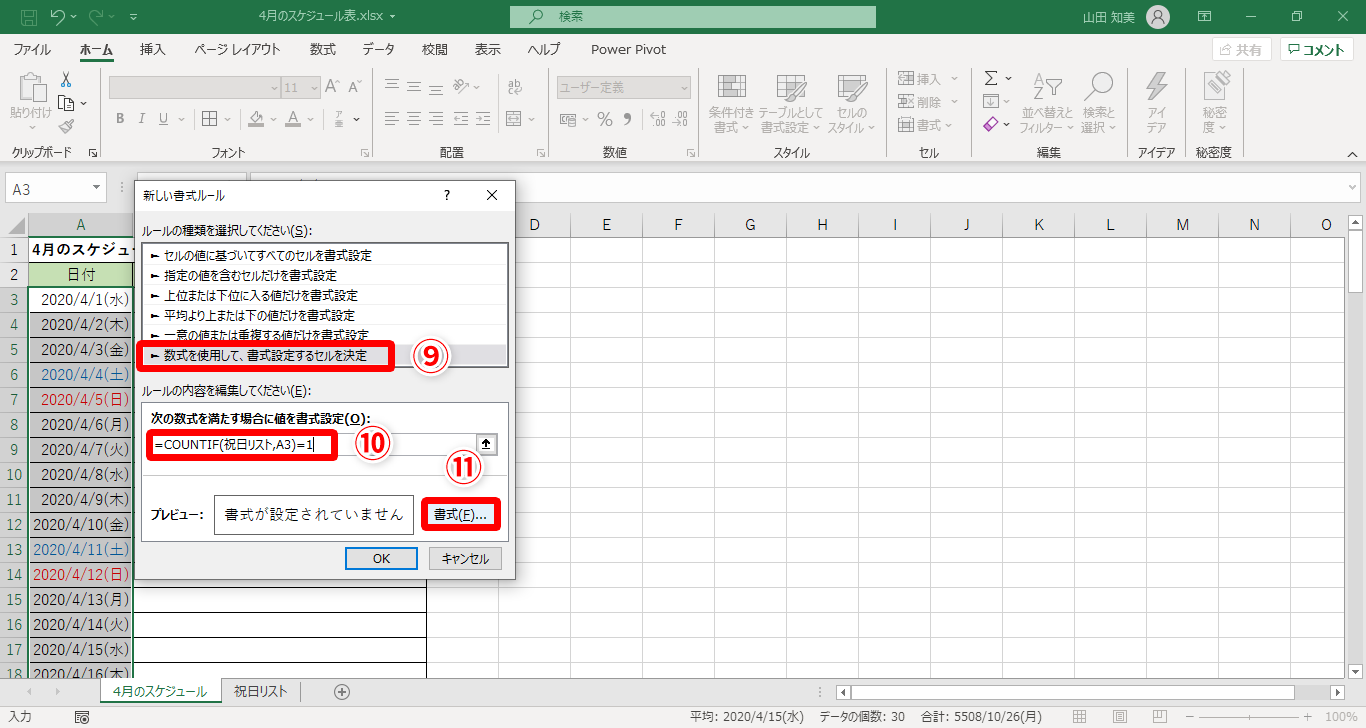 【Excel】土曜は青、日曜は赤、祝日はオレンジに!エクセルのスケジュール表で日付を色分けする方法(12/15)