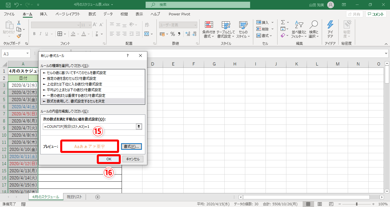 【Excel】土曜は青、日曜は赤、祝日はオレンジに!エクセルのスケジュール表で日付を色分けする方法(14/15)