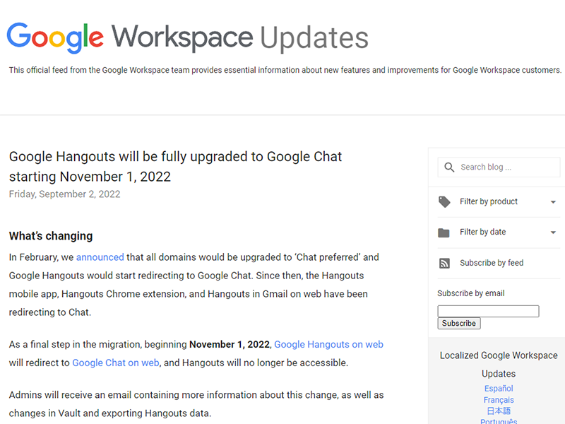 「Google Workspace」の「ハングアウト」が「Google Chat」に強制アップグレードへ