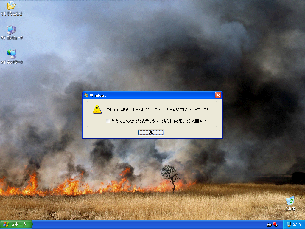 マックロソフト、延長サポート終了後のXPの壁紙「草原」を「焼け野原」に
