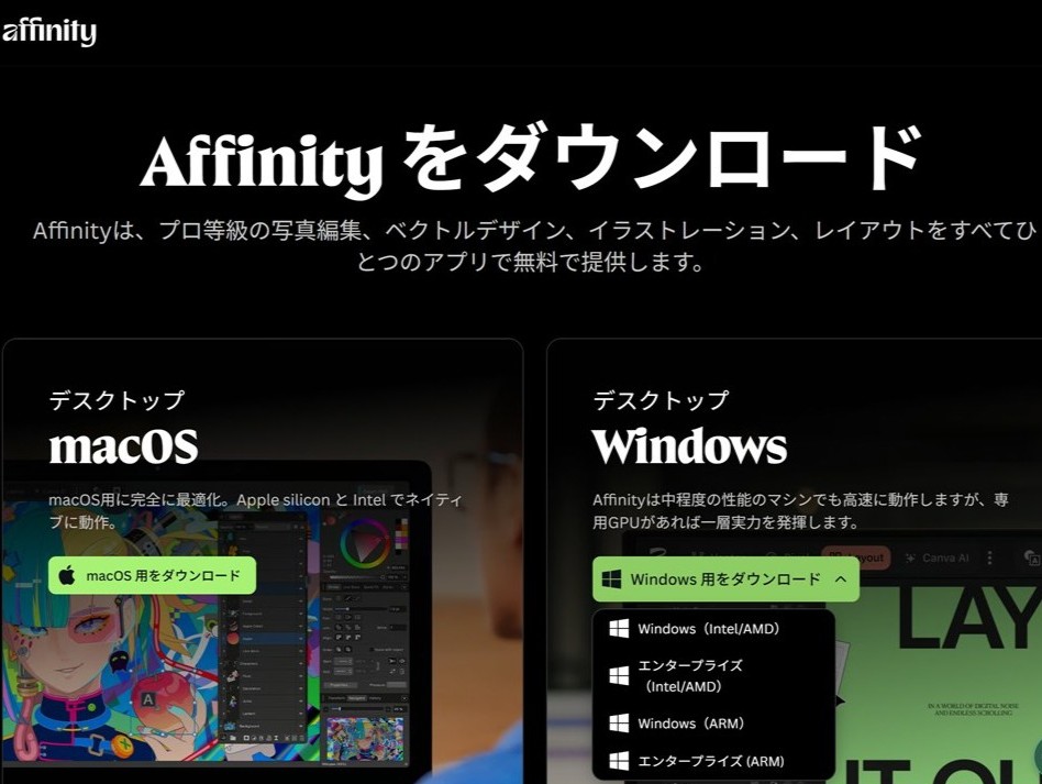 「Affinity」の利用を開始するには、公式サイトから「Canva」のアカウントを作成してログインしたあと、対応するインストーラーを選択してダウンロードする。アプリをインストールして起動後に、アプリから「Canva」のアカウントでログインすれば始められる。Windows / Macに対応しており、Windows版はARM64プラットフォーム(Windows on Arm)もサポートする。