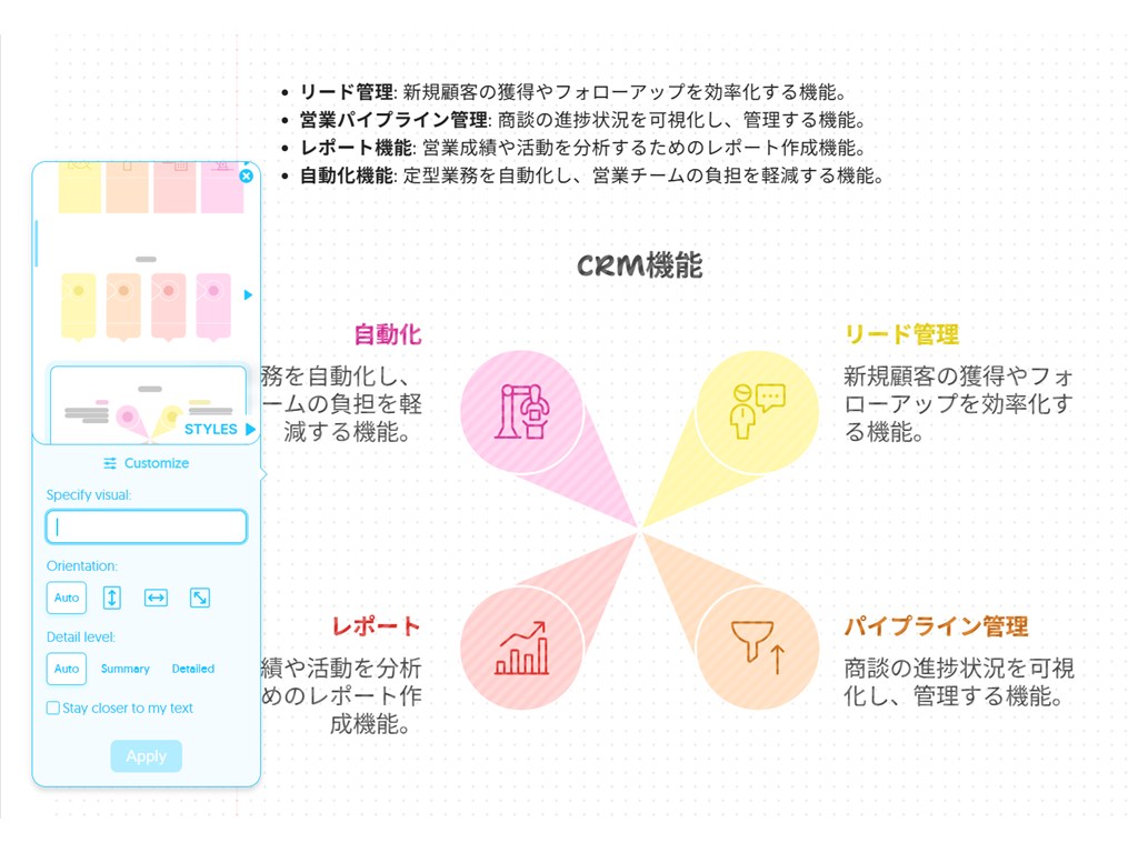 図解は、段落か範囲を選択しカミナリ型のアイコン([Generate Visuals])をクリックすると生成できる。作成と同時に大まかな形を決めるスタイル一覧が表示され、スタイルの中でさらに細かな候補を選ぶことが可能だ。好みのスタイルがない場合は、一覧最下部の[More]から新たなデザインを追加できる。