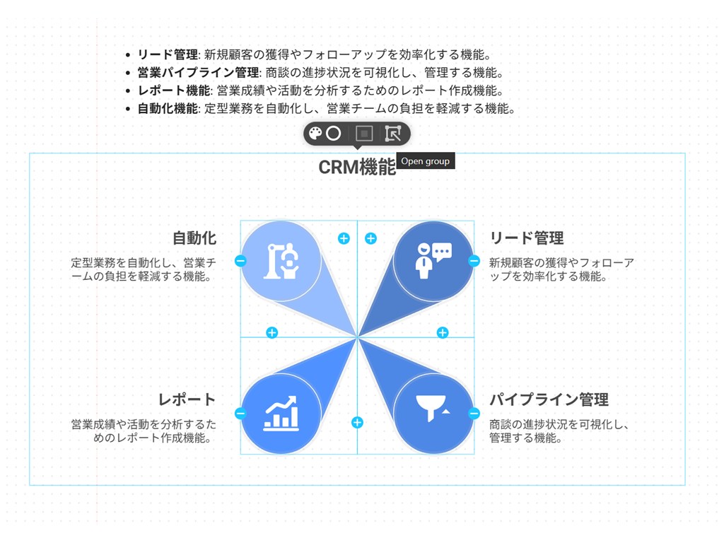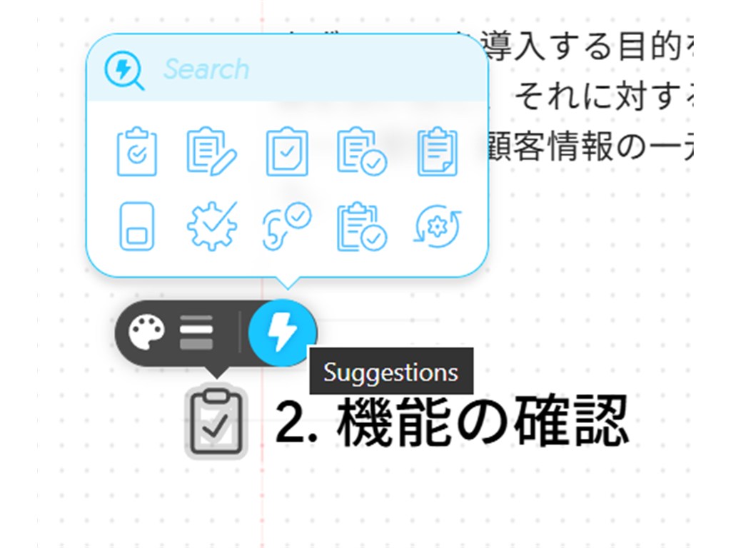 図解作成後も再編集が可能で、マークデザイン、テキスト、線や枠などを個々に変更可能。また、ペン型のアイコンの[Sketch]を使用すると、自由に線を書き足せるため、図の調整だけでなく、ドキュメントのどこにでも線を加える事ができる。