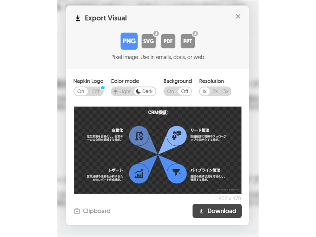 用途としては、資料やスライドの作成、ブログやドキュメントの挿絵、SNS用の画像など多岐にわたる。アイデアをビジュアル化して思考を整頓するメモ帳としても優秀だ。作成した図解はPNG / PDF / SVG / PPTファイルとしてダウンロード可能。ユーザーインターフェイスは英語だが、入出力は日本語に対応している。
