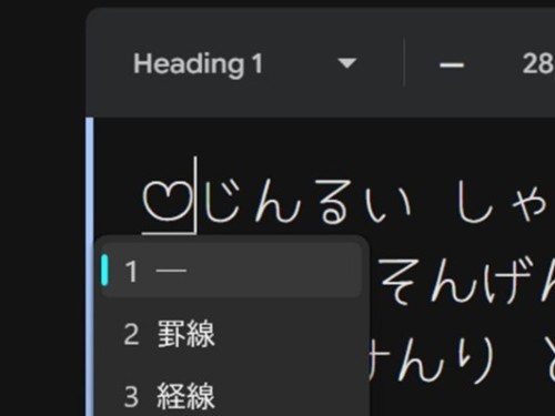 ひらがな、カタカナ、英数字、記号、絵文字に加えて、すべての教育漢字とJIS第一水準漢字、JIS第二水準、IBM拡張文字までの漢字、ラテン文字を収録している。